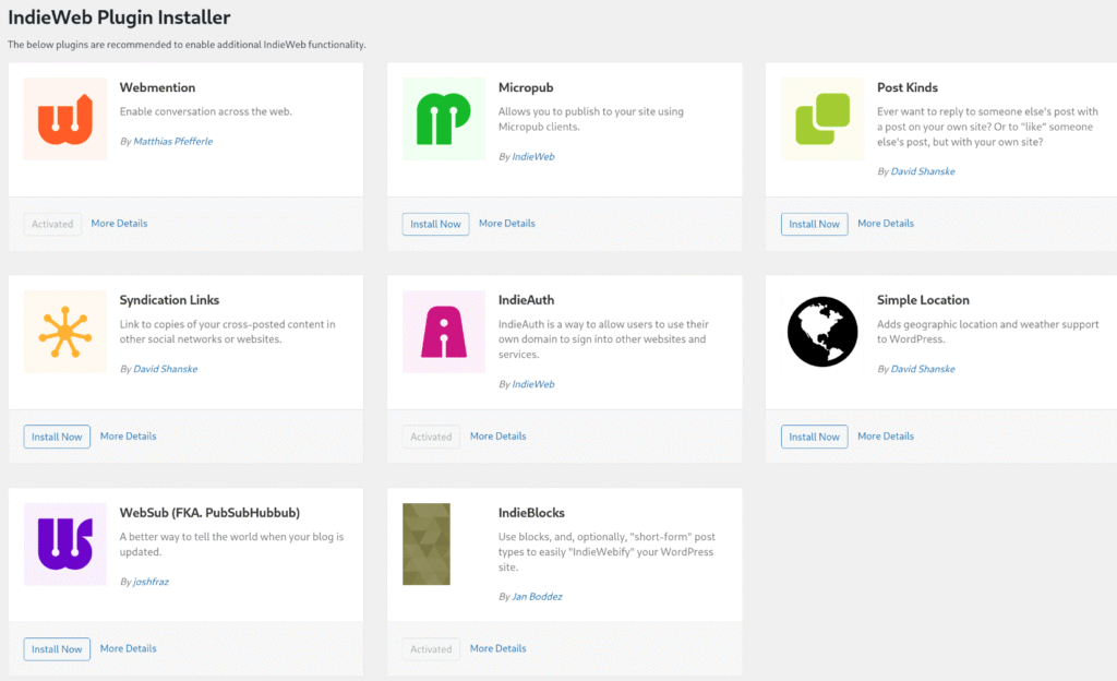 I also installed the IndieWeb plugin. This plugin wraps a bunch of other plugins that provide additional features. It’s a little unclear what, if anything, the core plugin does. But it collects a bunch of other plugins.